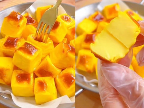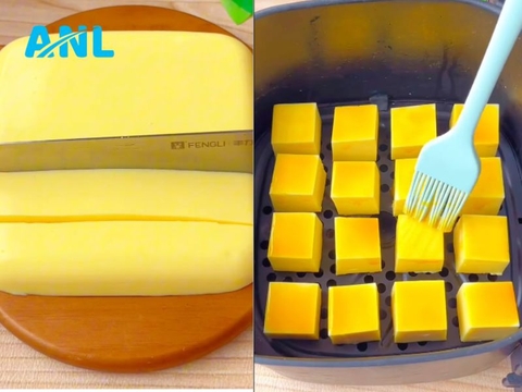 Đổ hỗn hợp vào khuôn hoặc khay, dàn đều mặt bánh. Để nguội và cho vào ngăn mát tủ lạnh ít nhất 1 tiếng cho bánh đông lại. Sau khi bánh đông, cắt thành từng miếng vừa ăn. Nếu thích bánh có lớp mặt vàng giòn, cho vào nồi chiên không dầu ở 150°C trong 15 phút.