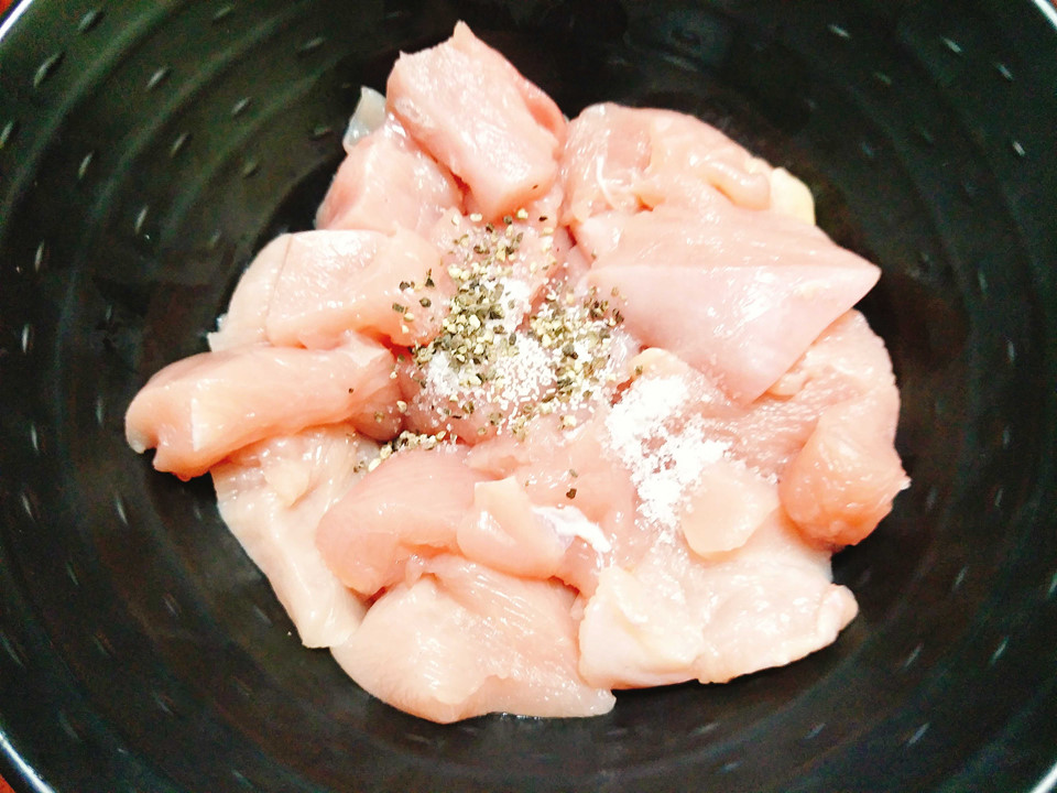Ướp thịt gà: Bạn cho thịt gà vào 1 bát tô rồi thêm 1/2 thìa cà phê muối, 1/2 thìa cà phê tiêu vào trộn đều nguyên liệu, ướp khoảng 15-20 phút cho thịt ngấm gia vị.