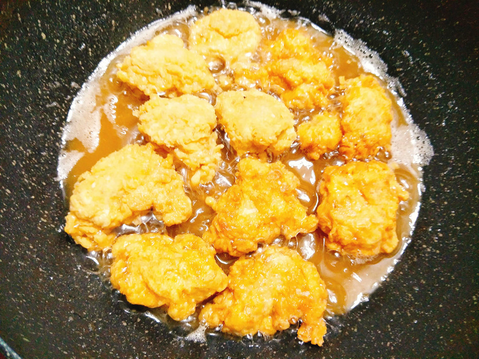 Đặt 1 nồi cho nhiều dầu ăn lên bếp đun cho dầu sôi, trong khi đó bạn đổ bột chiên giòn ra 1 bát tô, gắp thịt gà lăn qua bột chiên giòn sau đó nhúng vào tô bột ướt. Bạn tiếp tục gắp thịt gà lăn qua bột chiên giòn thêm một lần nữa và thả thịt gà vào chảo dầu đã sôi để chiên.