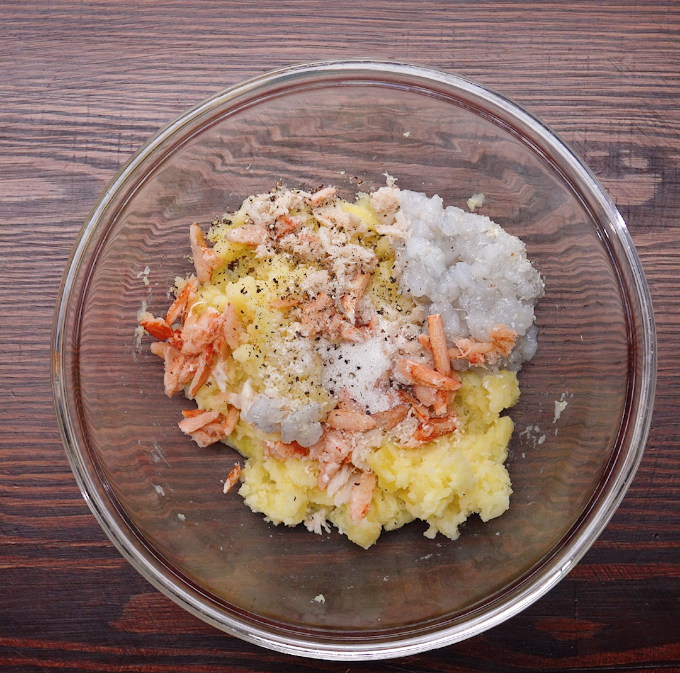 - Bạn thêm vào tô thịt cua, thịt tôm, 1 muỗng canh hạt nêm, 1/2 muỗng cà phê muối, 1 muỗng canh đường, 1 muỗng cà phê tiêu.