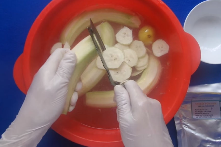 Bước 3: Sau đó cắt lát chuối đã gọt vỏ vào nước trên để cho chuối không bị thâm, chuốt chuối miếng tròn để cho món ăn thêm bắt mắt nha các bạn.