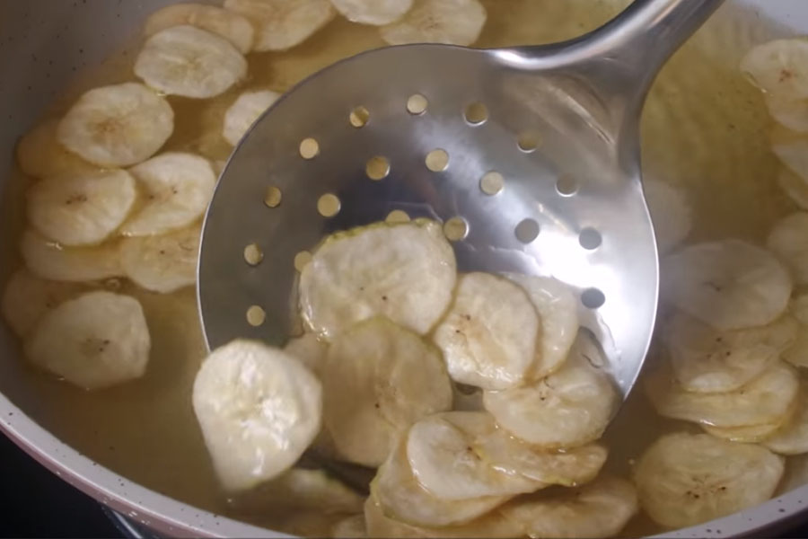 Bước 5: Bắt một chảo dầu thật nóng, cho chuối vào chiên đến khi vàng thì vớt ra để vào ray cho ráo dầu
