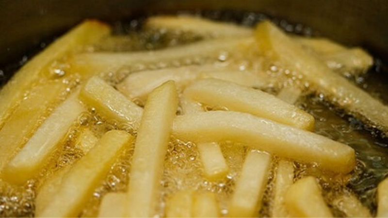 Đưa chảo lên bếp cho ráo nước, Cho lượng dầu ăn vừa phải vào, Cho dầu sôi thì cho khoai tây vào chiên. Bạn chiên khoai tây 2 lần, lần 1 bạn chiên sơ 5 phút rồi vớt ra để ráo dầu 10 phút , lần 2 chiên giòn 7 phút và cũng để cho ráo dầu.