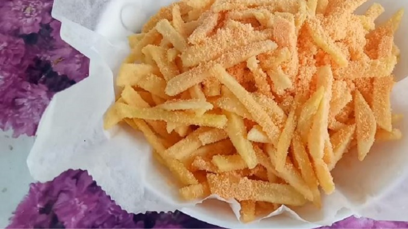 Chiên xong, đợi 10-15 phút cho ráo bớt dầu, bạn bỏ vào khay hay nồi sạch, trộn phô mai vào lắc đều. vậy đã hoàn thành món khoai tây chiên lắc phô mai ngon lành!