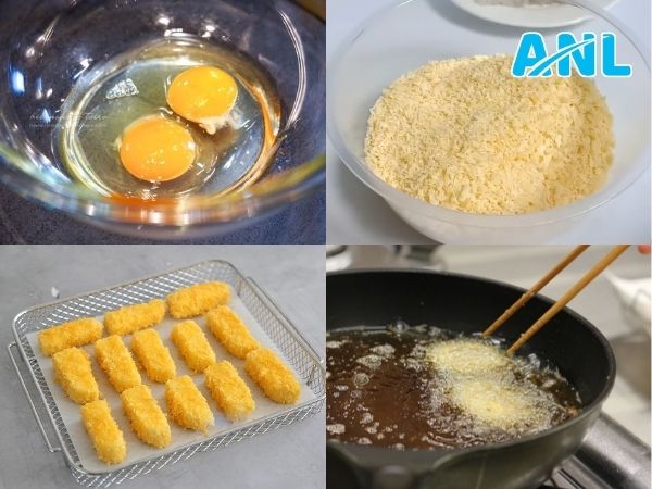 Nhúng lần lượt các miếng sữa tươi đã cắt vào trứng gà, sau đó lăn qua một lớp bột chiên xù cho đến khi bột áo đều hết tất cả.