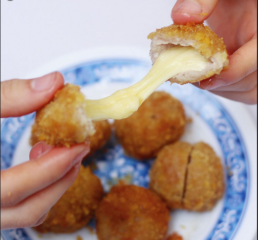- Bước 4: Lấy 1 lượng bột tầm 10 gram, cho nhân phô mai vào bên trong rồi vo thành từng viên. Nhúng vào hỗn hợp bột (pha với tỷ lệ 2 bột : 1 nước),sau đó nhúng qua 1 lần bột khô.