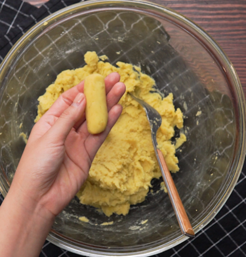 - Bước 2: Trộn đều bột và khoai đã nghiền, với tỷ lệ 200g bột : 500g khoai, cho đến khi thành khối dẻo.