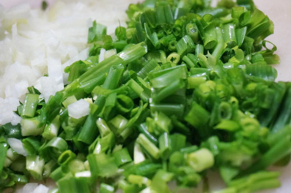 - Bước 2: Hành lá rửa sạch, cắt khúc vừa ăn. Hành tây bóc vỏ, rửa sạch và bổ múi cau hoặc thái nhỏ tùy ý