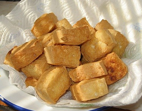 - Bước 3: Đậu phụ lăn qua bột năng rồi cho vào rán trong chảo dầu đã đun nóng. Sau khi rán vàng đều 2 mặt, vớt đậu ra đĩa có lót giấy thấm dầu
