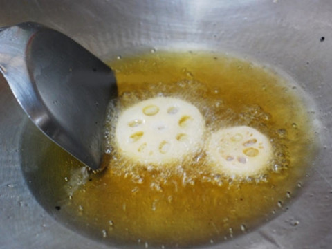 Bước 2: Đun nóng dầu ăn sau đó thả từng ít một củ sen đã lát mỏng vào chiên ngập dầu đến khi thấy củ sen vàng nhạt đều thì vớt ra